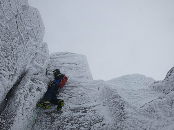 Beim Klettern ist die Absicherung bzw. nicht vorhandene Absicherung immer ein großes Thema. Selbst wenn irgendwo Haken im Fels stecken: Unter Schnee und Eis wird man sie kaum finden. Für Eisschrauben taugt das Eis oft nicht und Cams halten eher schlecht in vereisten Rissen.