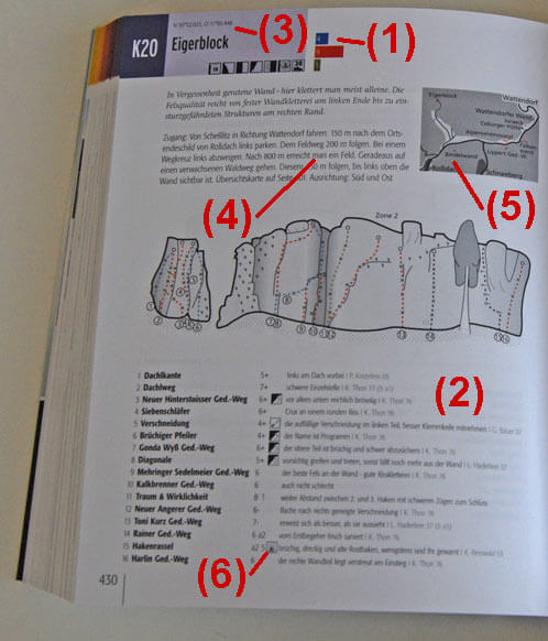 • Infos zur Route, z.B. ob diese überhängend ist, sonnig liegt oder ein paar Keile zur Absicherung braucht (6).