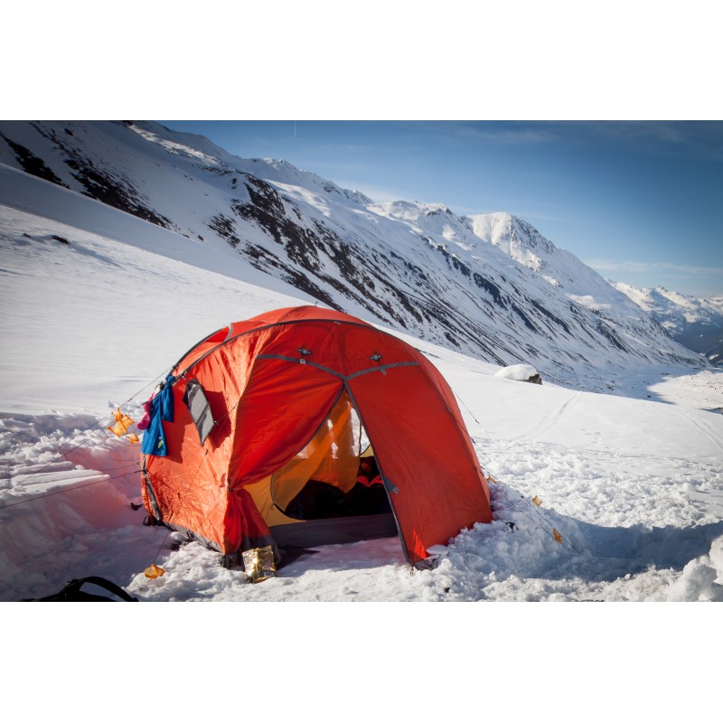 Durch das große Platzangebot und die vielen Ösen und Staufächer, lassen sich feuchte Klamotten gut im Zelt trocknen. Im Vorraum kann man gut sitzen und auch kochen, wenn man in der Hälfte des Vorzeltes ein "Loch" im Schnee aushebt.