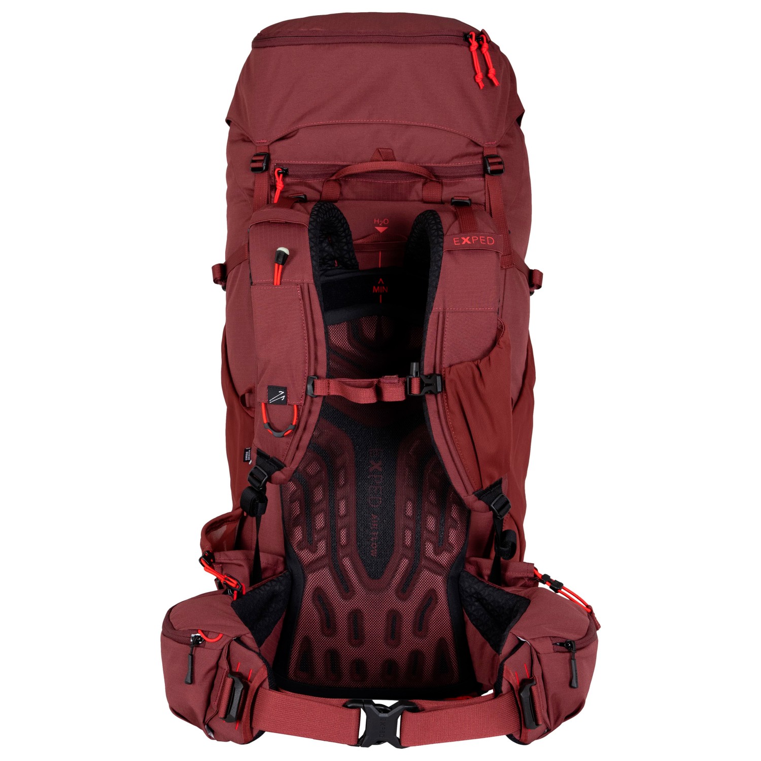 - 2 Flaschenhalterungen, 2 Hüftgurttaschen, Befestigung für Trekkingstöcke, Deckelfach, Stretchfach