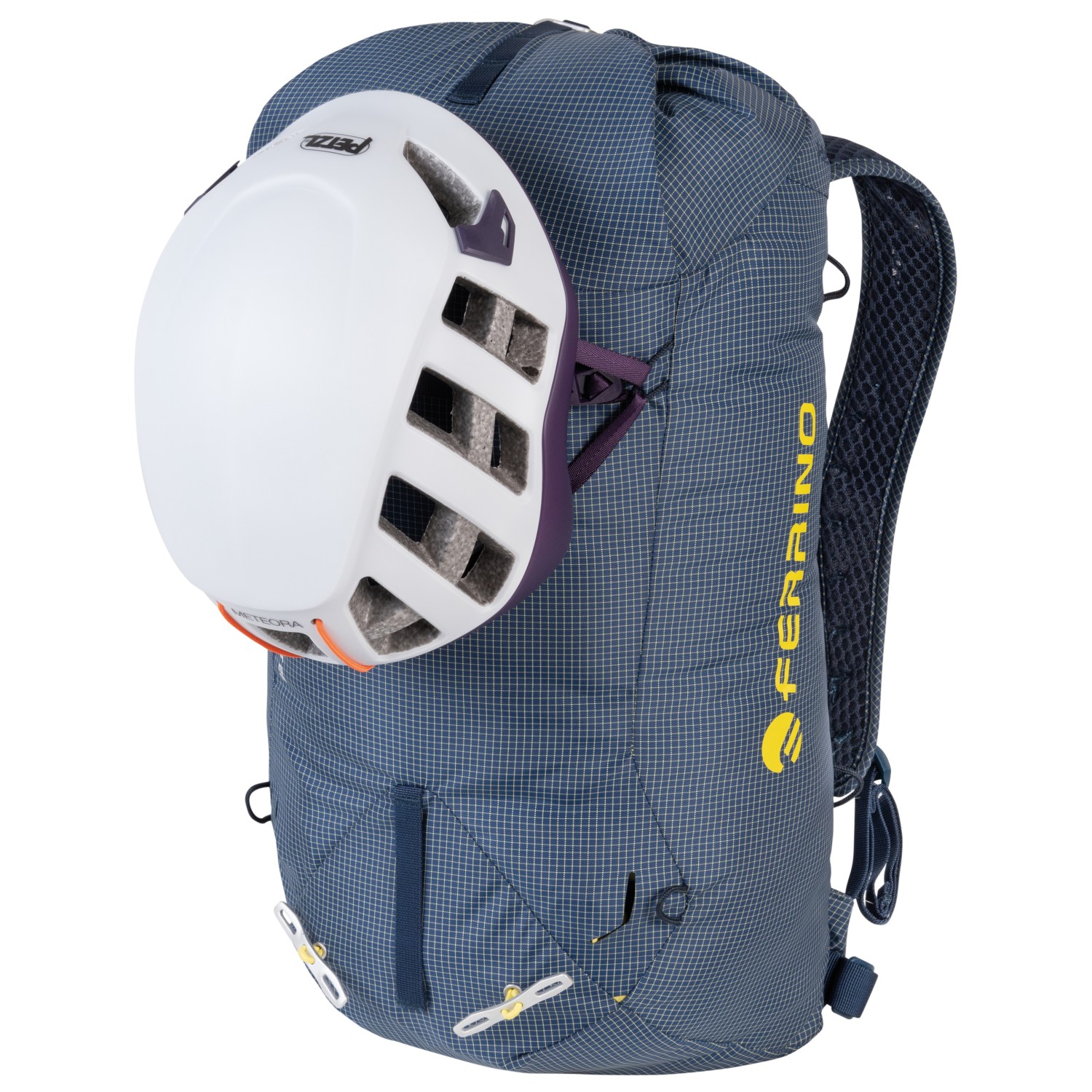 - Befestigungsriemen an der Vorderseite, Eispickel-/Stockhalterung, Helmhalterung, RV-Außenfach, Seilhalterung
