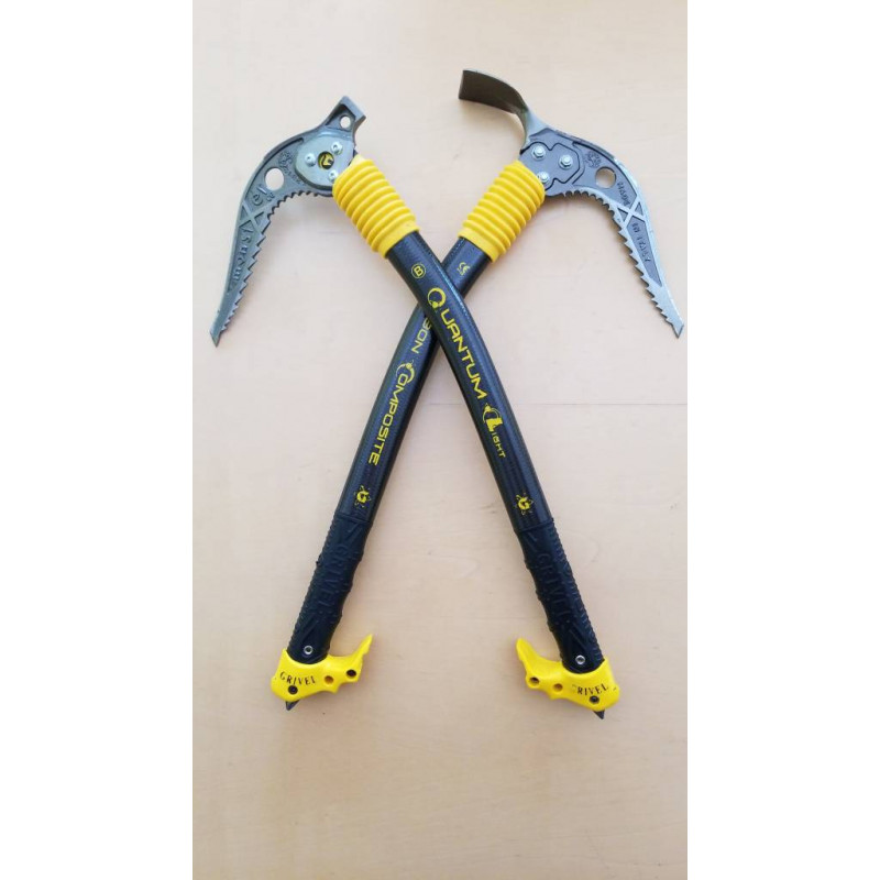 Im Einsatz waren die zwar noch nicht (Gletscher-Steilhang "Couloir de la Barre Noire" in Ecrins war nicht passierbar ...), aber schon montiert - auf Grivel Quantum Carbon Eisgeräte.