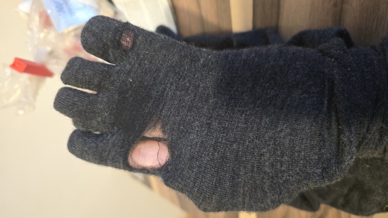 Meine ersten Zehensocken. Da nun jede Zehe einzeln "angezogen" ist, kann ich die Zehen einzeln wahrnehmen. Ich finde es wunderbar. Die Wolle ist angenehm auf der Haut (ich habe noch ein anderes Paar aus Synthetikfasern, die sind nicht so angenehm auf der Haut). Ich werde wieder Zehensocken kaufen. Wenn die Zehen nicht ganz grade sind, ist das Anziehen vielleicht etwas aufwändiger, aber es lohnt sich, weil nicht mehr Haut auf Haut liegt und man an diesen Stellen nicht so schwitz oder sie nicht aneinander reiben.