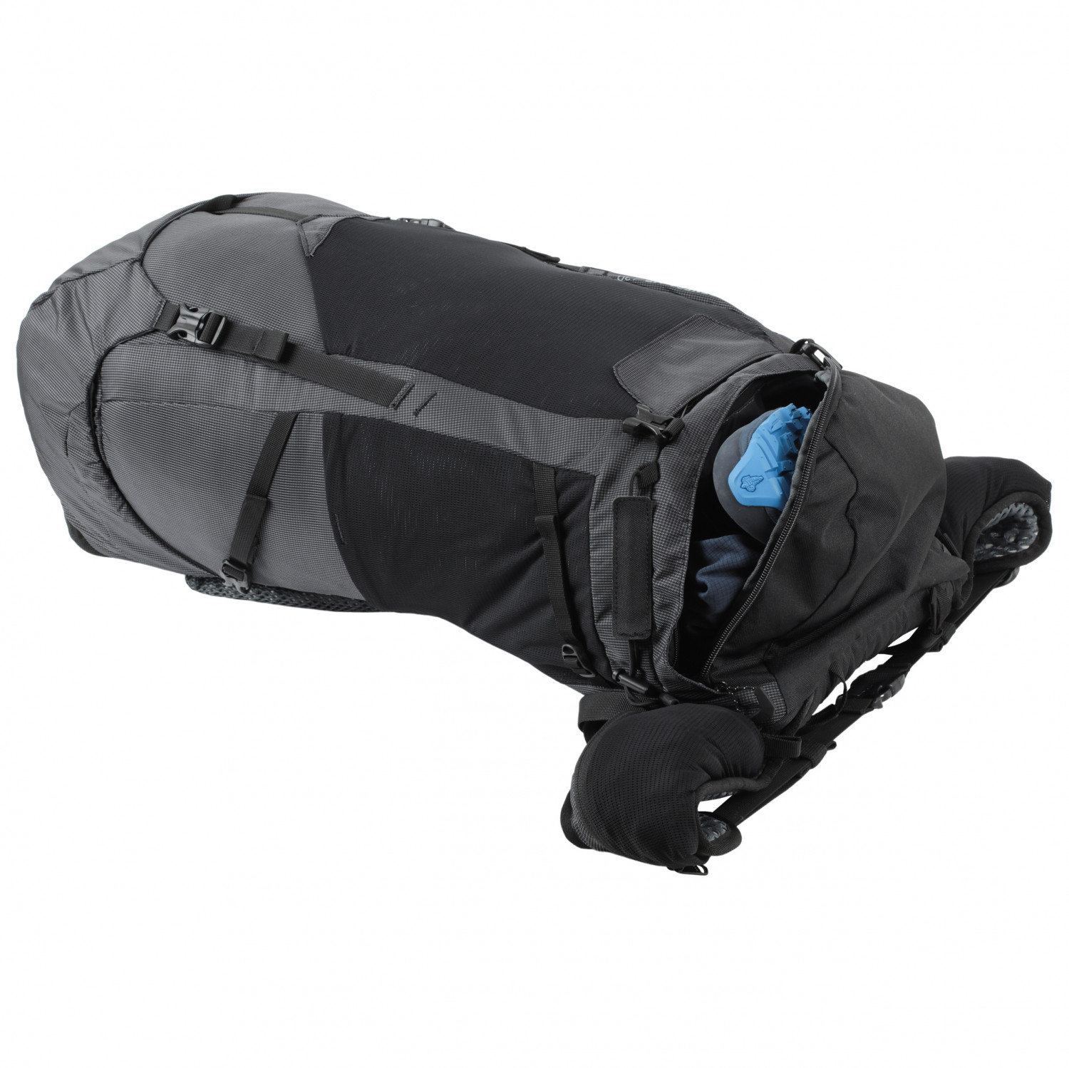 - 2 Seitenfächer, Bodenfach, Deckelfach, Eispickel-/Stockhalterung, Hüftgurttasche, Stretchfach, Tasche am Schultergurt