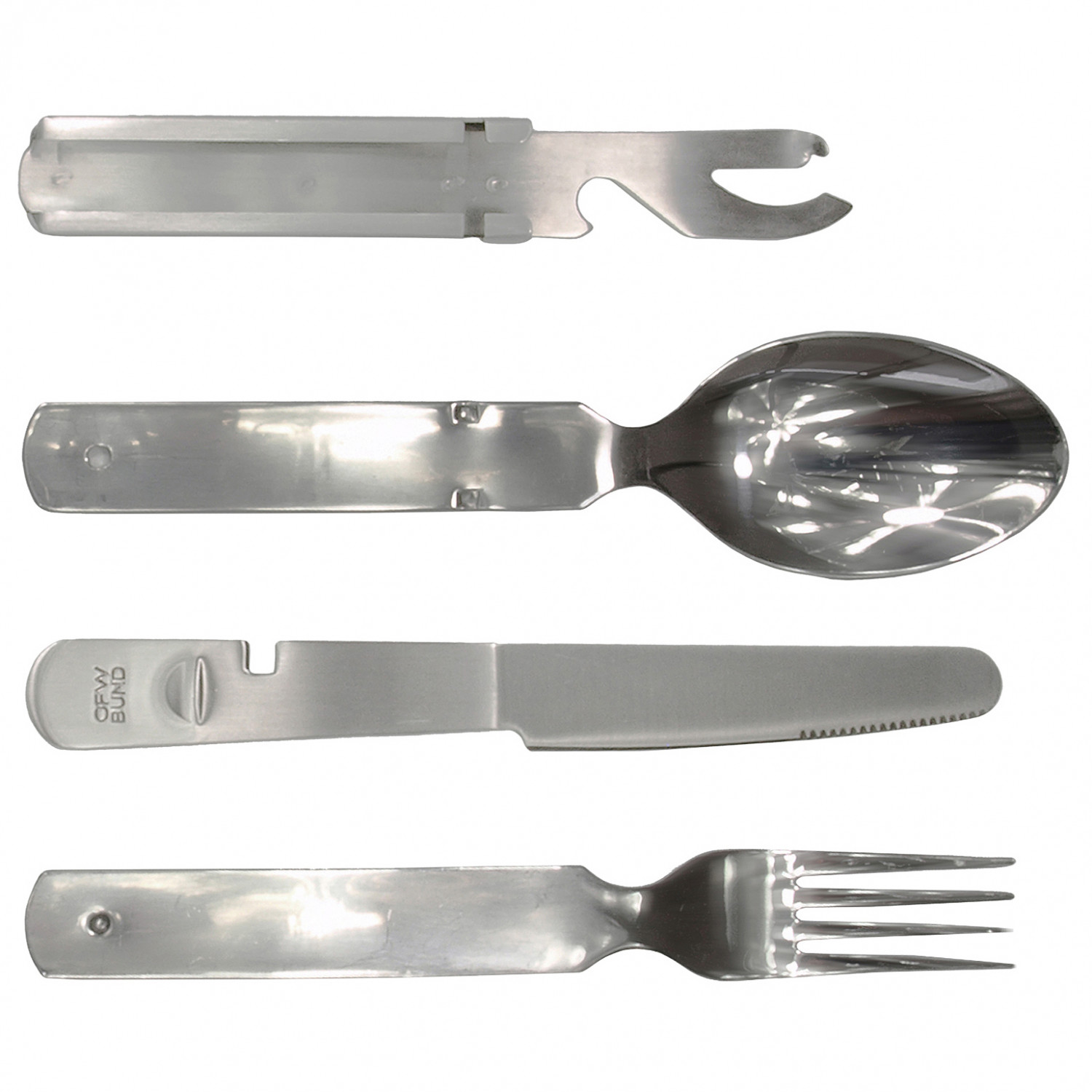- Set besteht aus Messer, Dosen- und Flaschenöffner, Gabel und Löffel