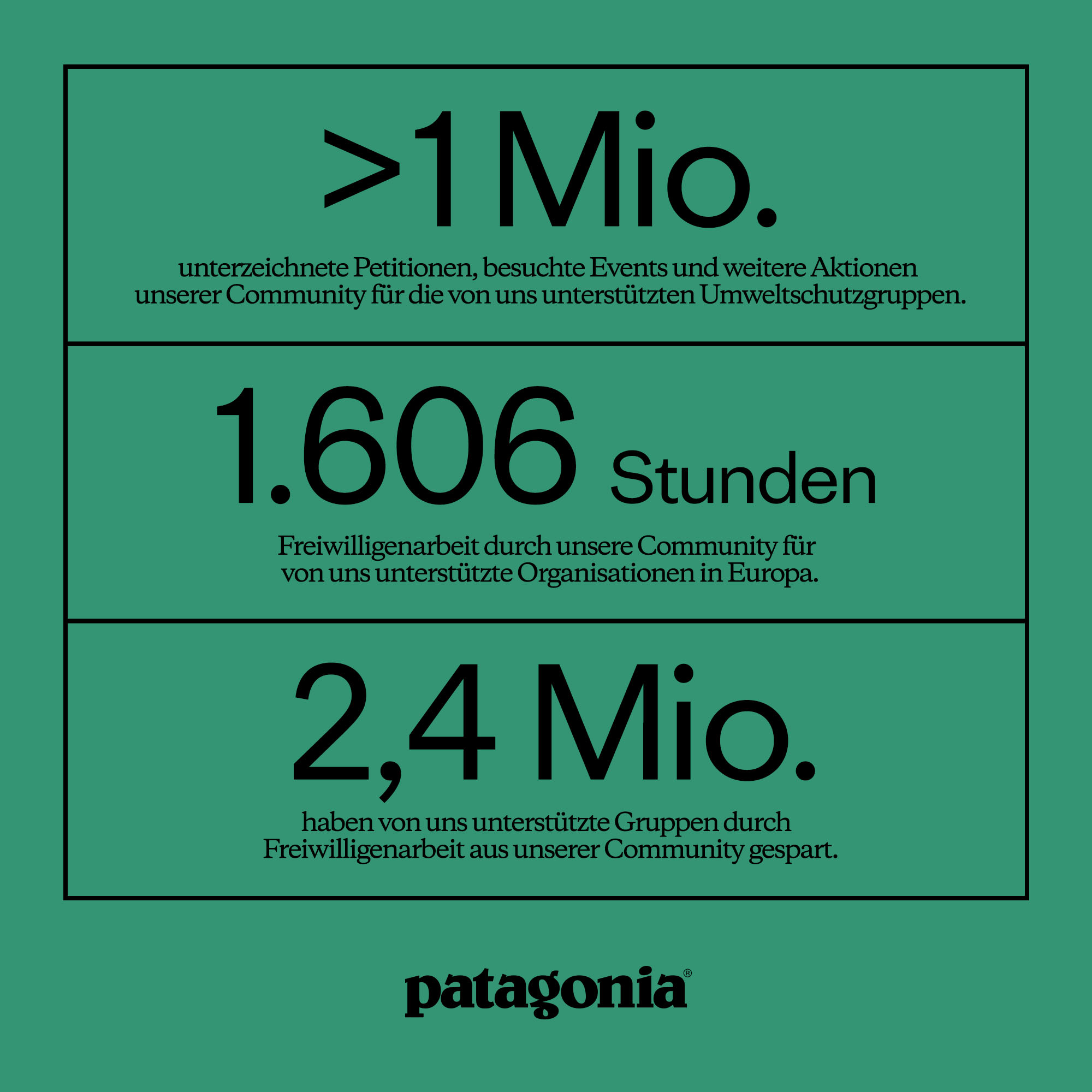 Seit Jahrzehnten spendet Patagonia 1% des Gesamtumsatzes an Klima- und Umweltschutzgruppen. Inzwischen sind Patagonia 5.700 andere Unternehmen aus 100 Ländern gefolgt und haben sich dieser Bewegung angeschlossen.