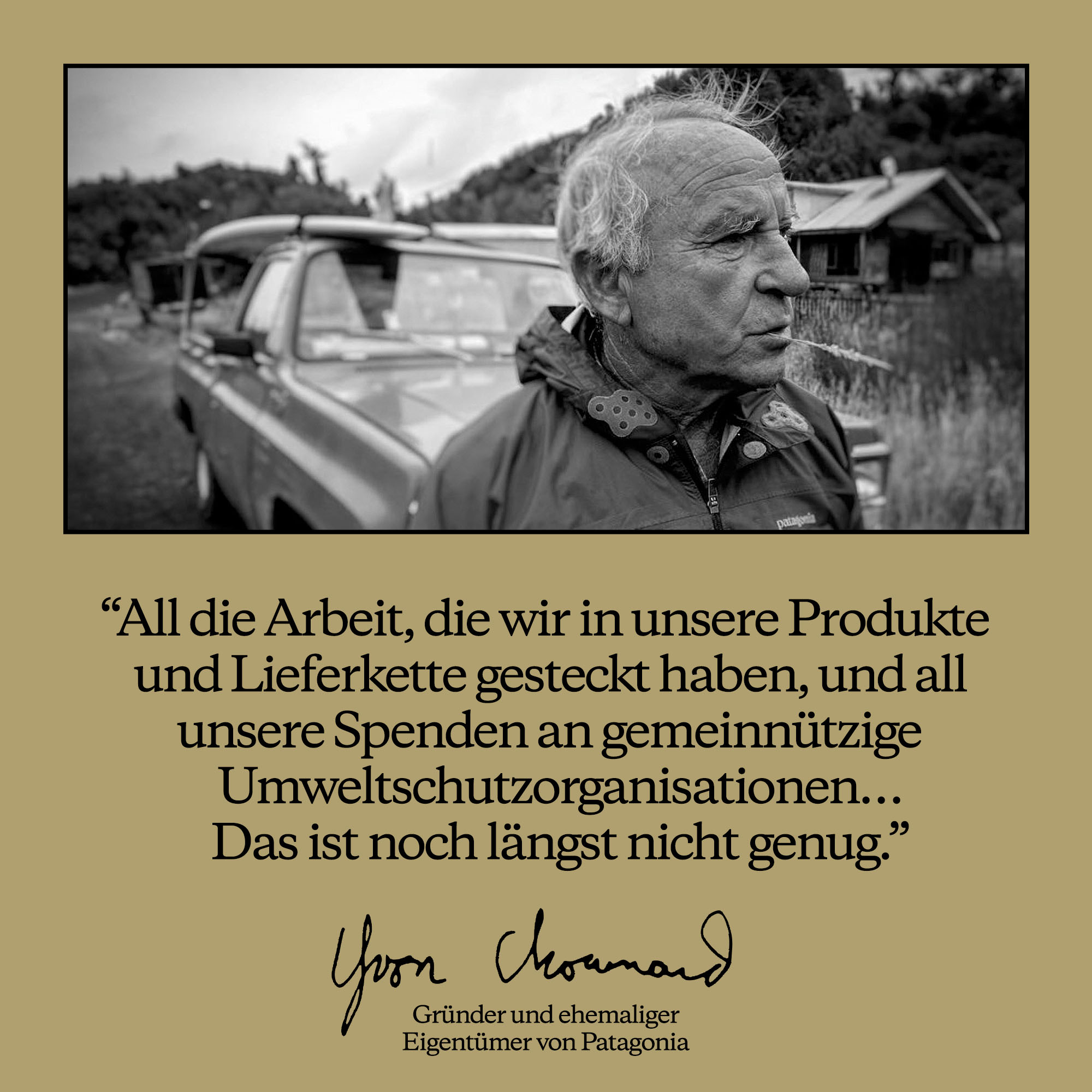 Patagonia ist im Geschäft, um unseren Heimatplaneten zu retten. Patagonia ist ein Unternehmen für Outdoor-Bekleidung mit Sitz in Ventura, Kalifornien, und wurde 1973 von Yvon Chouinard gegründet. Als zertifizierte B Corporation und Gründungsmitglied von "1% for the Planet" ist das Unternehmen weltweit für seine Produktqualität, Aktivismus und Spenden an Umweltschutzorganisationen in Höhe von mehr als 230 Millionen US-Dollar bekannt. Die einzigartige Eigentümerstruktur von Patagonia zeigt, dass die Erde die einzige Anteilseignerin des Unternehmens ist: Gewinne, die nicht in das Unternehmen reinvestiert werden, werden als Dividenden zum Schutz des Planeten ausgeschüttet.