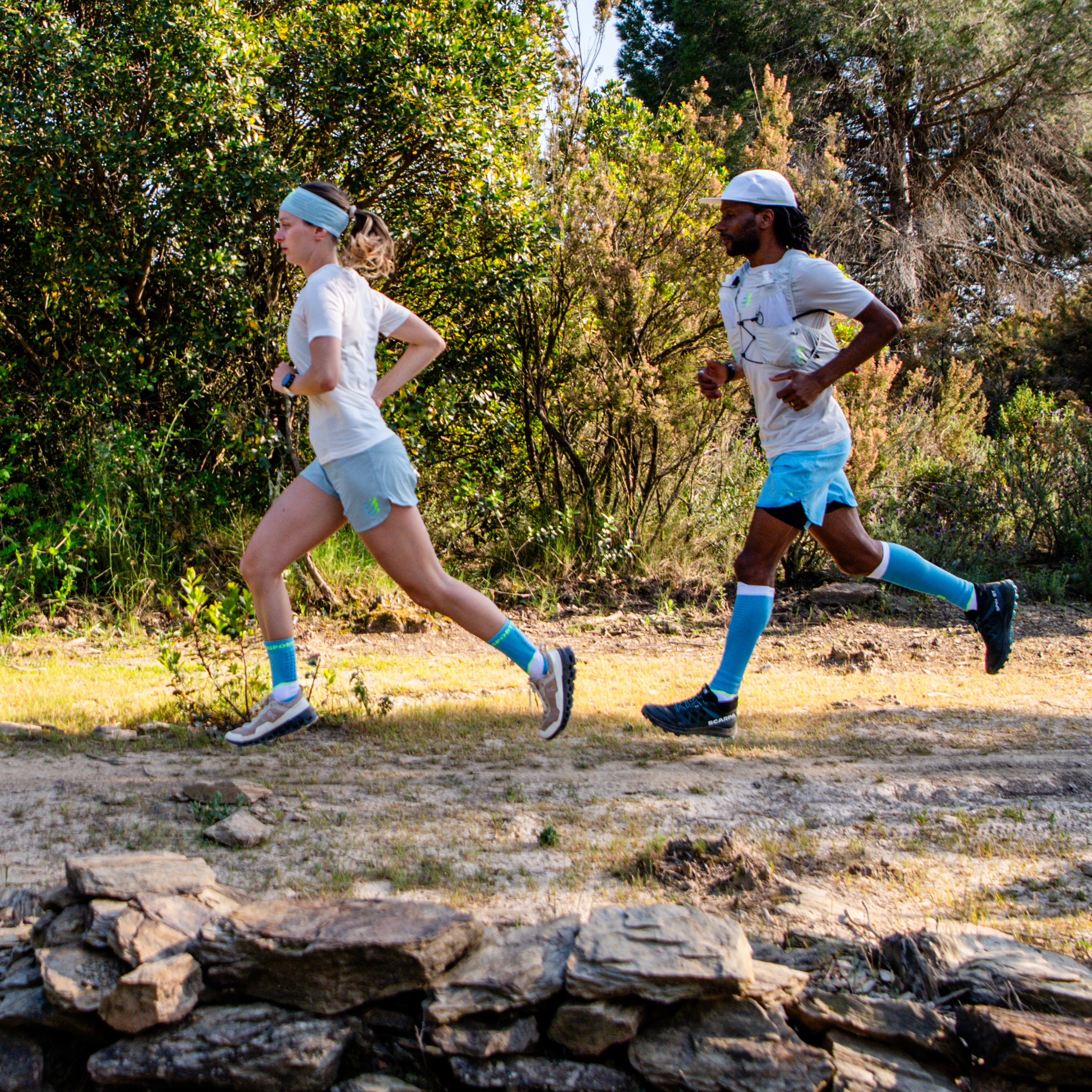 Das wohl wichtigste Ausrüstungsstück des Trailrunners sind seine Schuhe. Sie sind die griffige Antwort auf losen und unebenen Untergrund und halten Dich in der Spur,wenn es brenzlig wird. Sie müssen einfach bequem sein und passen. Die Sohle sollte auf die Gegebenheiten angepasst sein, bei weichem Untergrund darf es also ruhig etwas tiefer sein, um optimale Traktion zu bieten. Und wenn Du es mit viel Fels zutun bekommst,ist ein Zehenschutz nie verkehrt.